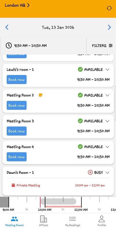 Select the Meeting Rooms tab at the bottom of the screen to view a card-style list of all available meeting rooms.